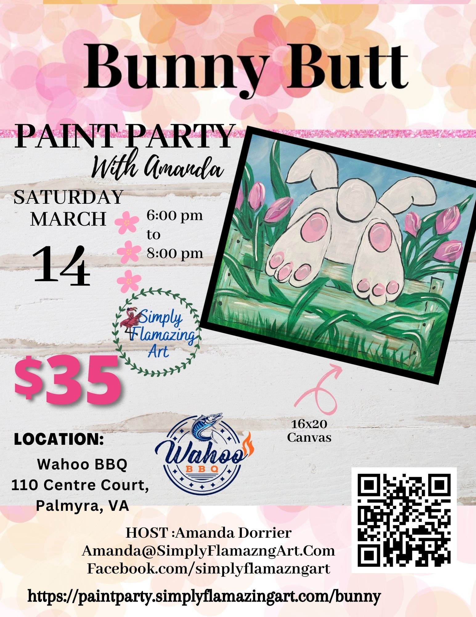 Includes all supplies, 16x20 canvas, I walk you through step-by-step painting your bunny butt painting.