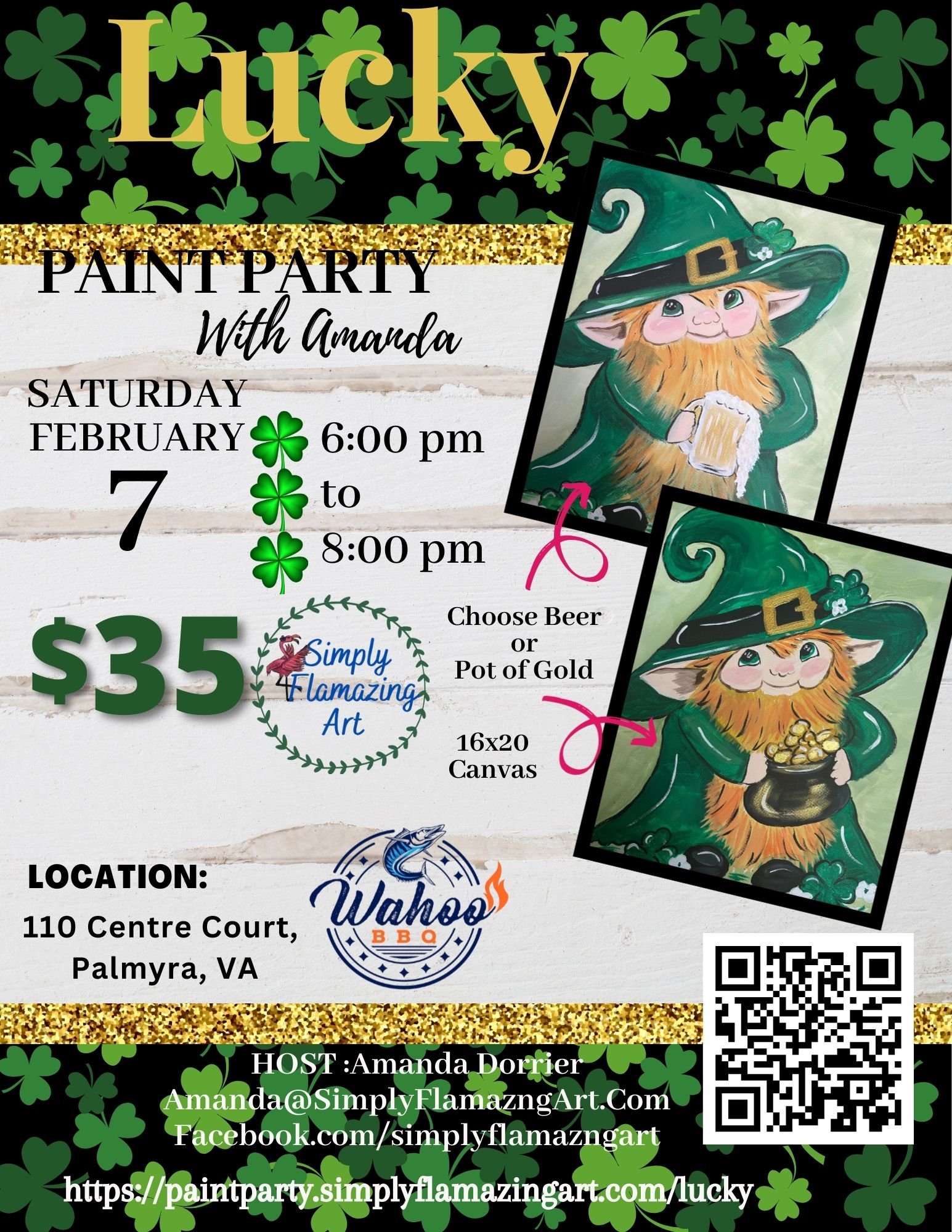 Join me for a fun evening of painting. Bring your family or friends and plan on having a lot of fun painting your choice, Lucky with a Beer or Lucky with a Shamrock, you decide .